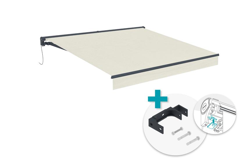 - Béžovú polyesterovú látku (D. 295 cm x Š. 250 cm) - Valec na látku (Ø 7 cm x D. 286 cm) - 2 veľké ramená (prierez 56 x 31 mm) - 2 malé ramená (prierez 51 x 25 mm) - Integrovaný elektromotor a diaľkové ovládanie - Ručnú kľuku - Snímač vetra - Súpravu na montáž na stenu